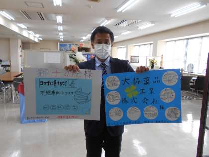 大協薬品工業(株)様、獅子の会様、戸田電気鉄鋼(株)様に、健康四つ葉委員会が代表して作成したメッセージカードを届けに行ってきました。写真撮影にも快く承諾をいただき、受け取っていただきました。