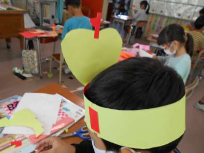 最初は、頭に付ける飾りだけだったのですが、腕や腰、足等、どんどん飾りが増えていきました。笑顔や笑い声が絶えない学習でした。