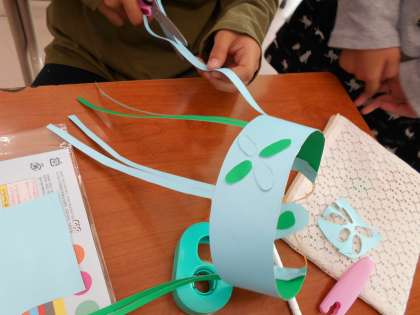 画用紙を丸め、材料のつなぎ方を工夫して、身に付けて楽しく変身する飾りを作っています。