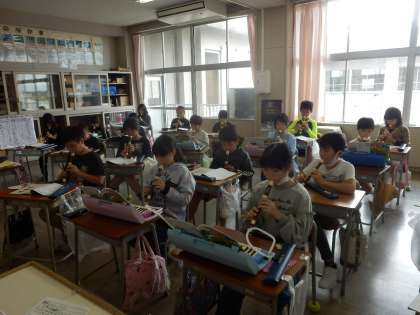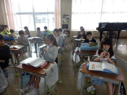 4年生音楽はまずリコーダーです。「陽気な船長」や「オーラリー」といった曲を練習しています。上パートと下パートがあり、重なりがとてもきれいです。