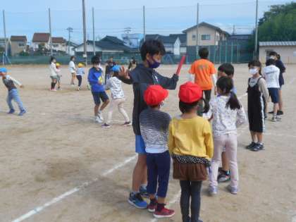今年度は、上学年が下学年に教える姿がたくさん見られました。一番上の写真は、昨日の昼休み、自主的に団別リレーのバトンパスを練習しているところです。