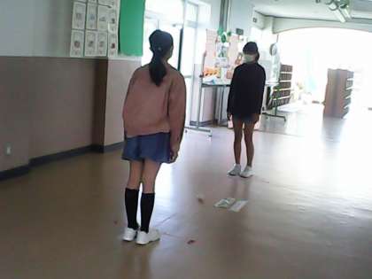 友達とソーシャルディスタンスを意識して向かい合ってみました。みなさんは、最近ソーシャルディスタンスを意識していますか?マスクをしていない時は、ソーシャルディスタンスをしっかり意識して生活しましょう。ソーシャルディスタンスの距離が分からない時は、中央廊下で確かめてみてください。