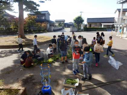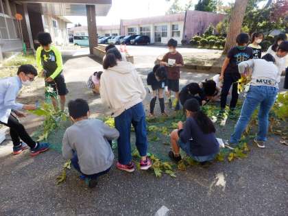 ヘチマが茶色くなって種がとれるようになったものも出てきました。しかし、4年生は、「たわしを作りたい」という希望があるので、緑のものも収穫しました。