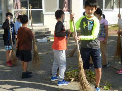 遠目で見ているとちっちゃい葉も、近くで見ると大きいです。収穫した後は、枯れたくきをとって、来年度の4年生のためにネットをきれいにしました。緑のヘチマをたわしにするのは臭い匂いがともなうそうです。でも柔らかいたわしになります。自然に茶色まで乾かすと匂いはありません。でも、とっても堅いたわしになります。どちらのたわしにしましょうか?