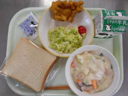 今日の献立は、食パン、牛乳、ポークパコラ、ゆでキャベツ、ミニトマト、チンゲンサイのクリーム煮、ブルーベリージャムです。明日の献立は、ご飯、牛乳、さつまいもの天ぷら、昆布和え、すき焼きです。