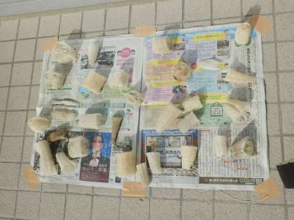 4年生 ヘチマたわし作り4☆ 公開日 2020/10/26 更新日 2020/10/26 4年生 干して完成です。早く持って帰りたいという子供たち。ちょっと数が少ないので天日干しの物ができたらみんなで分けましょう。