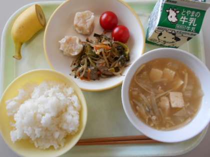 今日の献立は、ご飯、牛乳、かにシューマイ、レバニラ炒め、フルーツトマト、中華スープ、バナナです。今日のフルーツトマトは富山県産です。明日の給食は、ご飯、牛乳、鶏肉のバーベキューソース味、海藻サラダ、高野豆腐の卵とじです。