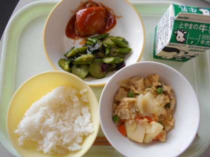 今日の献立は、ご飯、牛乳、鶏肉のバーベキューソース味、海藻サラダ、高野豆腐の卵とじです。明日の献立は、ご飯、牛乳、ふくらぎの甘味噌かけ、バンサンスー、キノコ汁です。