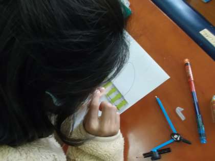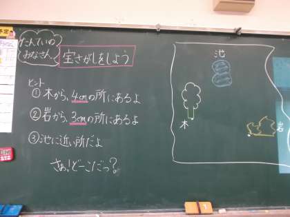 子供たちは一生懸命。最初は、「木から4センチのとこなんてたくさんありすぎてわからない。」と言っていましたが、グループで話しているうちに、「岩から三センチのところで木から4センチの所なんて2つだから、どっちかしかないよ。」など考えて、だんだん宝の場所がわかってきました。そして、宝を見つけることができました。