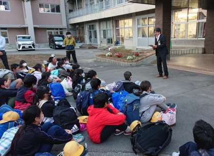 そして、学校に戻ってきた子どもたち。時間の遅れはありましたが、けがもなく、無事に校外学習を終えることができました。代表児童が今日の学びを先生方に報告し、最後に校長先生からお言葉をいただきました。実り多い1日となった校外学習でした。