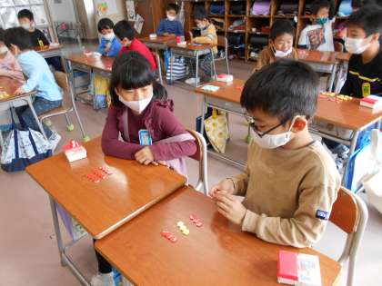 かけ算の学習が始まりました。おはじきを並べて式を答えあったり、かけ算の場面さがしをしたりしました。