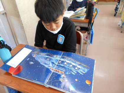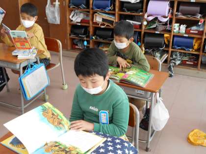 まずは、富山市立図書館水橋分館に行きました。司書の先生に図書館についての説明を聞いてから、本を借りました。学校の図書室よりもたくさんの本があり、驚いていました。学校にはない本もたくさんあり、とてもわくわくしながら本を選んでいました。読みたくてたまらないようで、学校に戻るとすぐに読み始め、「こんな本があったよ」と嬉しそうに話してくれました。