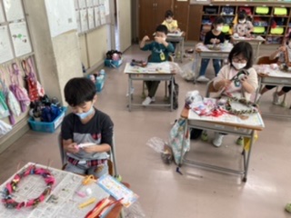 リボンや毛糸、秋見つけで拾ったどんぐりやまつぼっくり等を使って、どのリースも素敵に仕上がってきました。ボンドの扱いに苦戦していた子もいましたが、カラフルでにぎやかなリースになっていました。もう少しで全員完成しそうで、楽しみです。