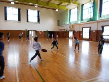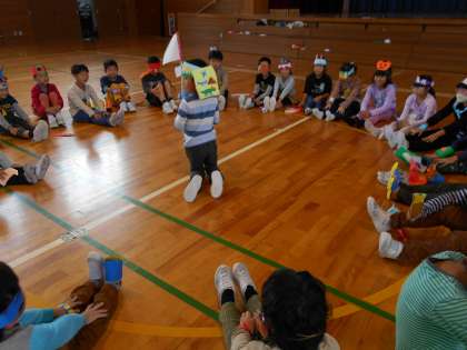 鬼ごっこでは、転んだ友達に優しく声をかけたり、ぶつかったときには謝り合ったりする姿が見られました。ドッジビーでは、あまり投げていない友達に譲る姿など、みんなで楽しく活動しました。仮装しておこなった震源地は、回数を重ねてきたのでみんなとても上手で、オニになった人は震源地を当てるのが難しくて大変そうでした。