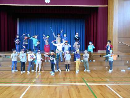 待ちに待ったハロウィン集会です。図工の時間に作った衣装を身に付けてにっこにこ!