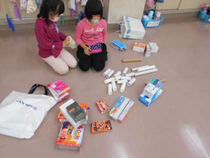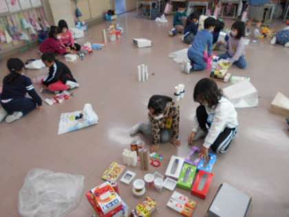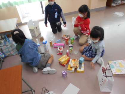 算数科「かたちあそび」の学習です。家から持ってきた空き箱や友達と一緒に、似ている形で仲間分けをしました。声をかけ合いながら、形の違いや共通点に気付き、楽しみながら学習することができました。