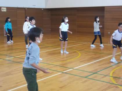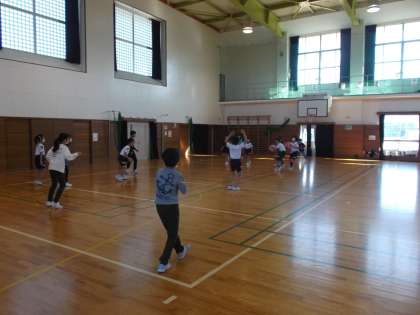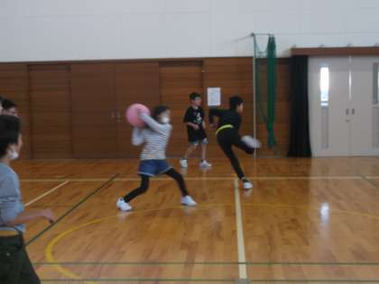 体育館でのドッジボールとキャッチバレーボールです。即席のチームですがみんな頑張っています。
