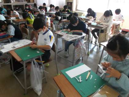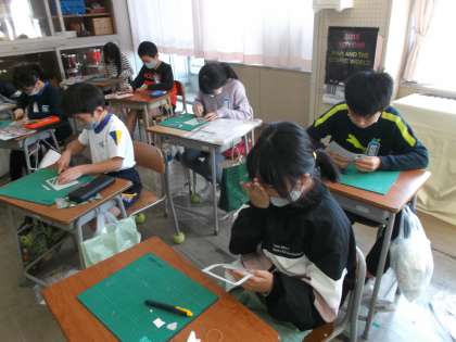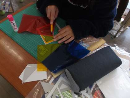 光とカラーセロハンを使ったランプ作りです。日光の光を入れてもとてもきれいなのですが、できあがりはライトを使って中から照らします。完成が楽しみですね。