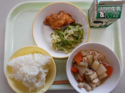 今日の献立は、ご飯、牛乳、魚の利休揚げ、レモン和え、鶏肉と根菜の煮物です。来週月曜日の献立は、ご飯、牛乳、サンマの生姜鰺、豚肉としらたきのピリ辛炒め、もずくの味噌汁、りんごです。