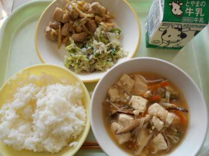 今日の献立は、ご飯、牛乳、あっさりチキン、ゆかり和え、豆腐の野菜あんかけです。明日の献立は、ご飯、牛乳、揚げ鯖のみぞれだれ、白菜のゆず和え、肉じゃがです。