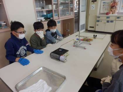 金属の棒や板がどのように温まっていくかを調べています。し温テープという、温まると色が赤く変わるテープで温まっている様子を観察しています。火を付けた直後でも、火の近くは赤く変わっていてビックリです。そこから順番に温まっている様子がよく分かりました。