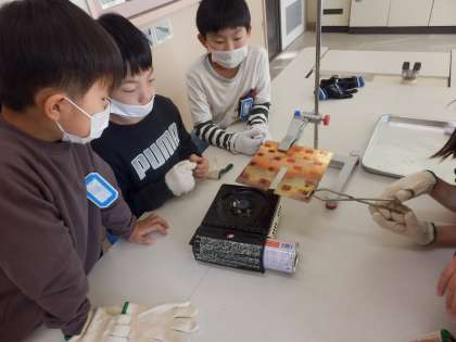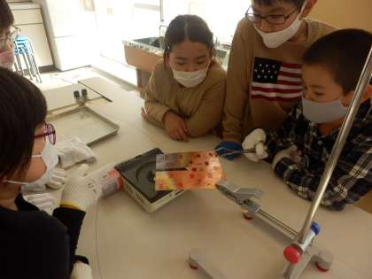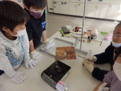 金属の板がどう熱せられていくかの実験です。前回の実験で、金属は熱したところから順に熱くなっていくことがわかったのですが、今日は間に切れ込みが入った凹方の板です。どうなるか実験に集中しています。