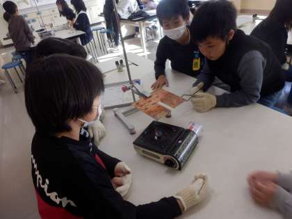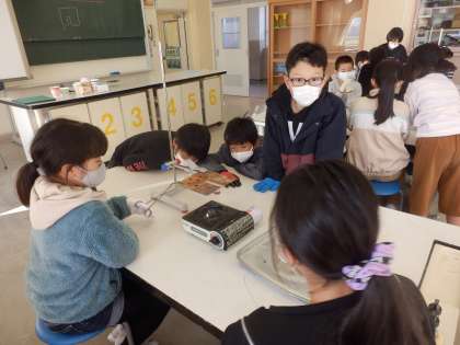 し温テープで温まる順をチェック!「今度はこっち側だ!」「ここ温まってきとる!」と子供たち。実際に実験をしてみると分かることがたくさんありますね。