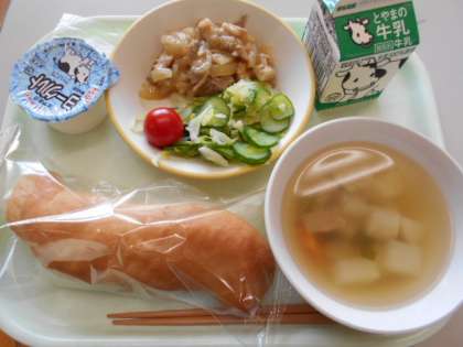 今日の献立は、米粉コッペパン、牛乳、とやまポークのアップルソース、添え野菜、ミニトマト、カブのスープ、ヨーグルトです。明日の献立は、ご飯、牛乳、鰆の塩焼き、ひじき炒め、厚揚げの錦とじです。