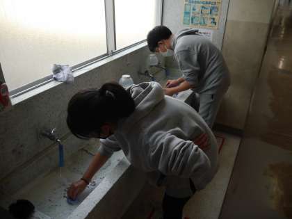 6年家庭科「クリーン大作戦」 公開日 2020/11/19 更新日 2020/11/19 6年生 家庭科「クリーン大作戦」の学習で、アクリル毛糸を手編みし、エコたわしを作りました。学校の中の汚れている場所を見付け、今回は6年生全員で、水場の掃除をしました。エコたわしは洗剤を付けなくても汚れがよく落ちるので、絵の具や墨のあともきれいになくなりました。今日の活動を振り返り、汚れをすぐに落とすことが大事だと考え、全校にも汚したらすぐにきれいにするようにと呼びかけました。