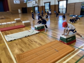 1年生の体育では、跳び箱運動に取り組んできました。先日、講師の先生に習った基礎の練習をこつこつとがんばり、開脚跳びができるようになったり、初めよりも高い段が跳べるようになったりしました。