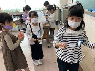 きょうの せいかつの じかんに、あつめてきた あきのもので あそんだり、おもちゃを つくったりしました。わたしは、かみコップと わりばしと ひもと まつぼっくりをつかって、けんだまを つくりました。やってみると、たのしかったです。