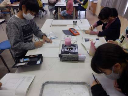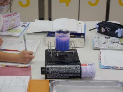し温インクを混ぜた水を熱します。温まるとピンク色にかわります。ピンクの水が動く様子も見えました。よーく観察している4年生です。