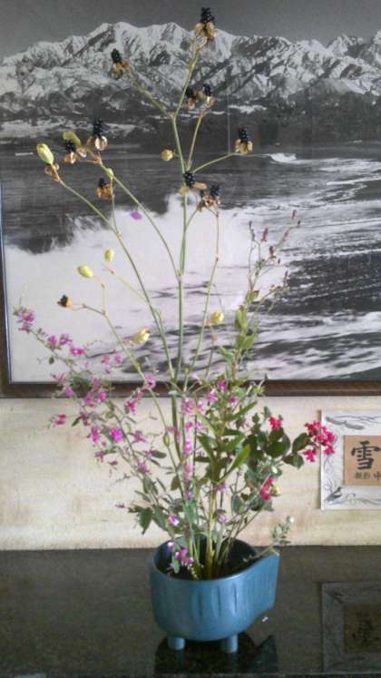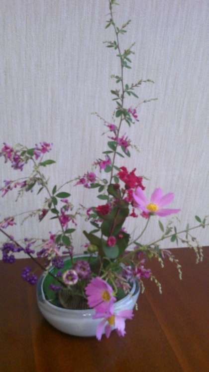 はぎ、こすもす、紫式部、檜扇(ヒオウギ)など秋の花が、学校の玄関を飾っています。