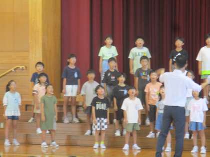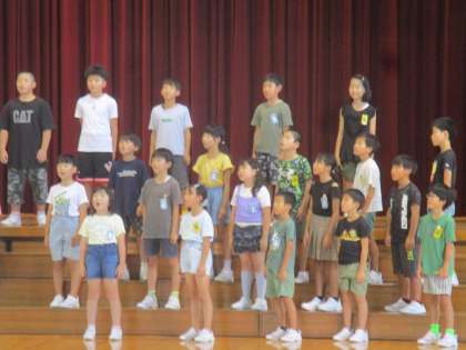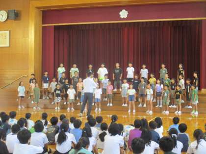4日の区域連合音楽会に向けて、全校の前で歌声を披露しました。少し緊張していた子供たちでしたが、きれいな歌声を体育館に響かせていました。