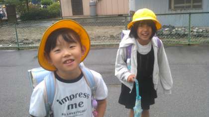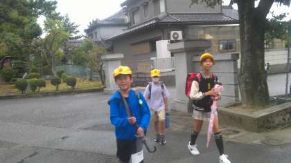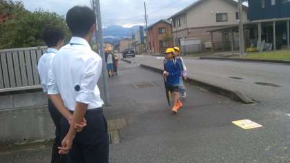 学びのアシストさん2名も校門前で子どもたちにさわやかな挨拶をしています。子どもたちの元気で明るい挨拶に、曇り空でもさわやかな朝に感じられます。