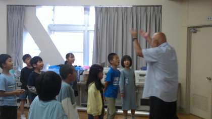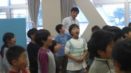 講師の久田先生をお招きして2回目の歌唱指導をしていただきました。最初に今までの練習の成果を聴いてもらうと、前回と比べてとっても上手になったと褒めてもらいました。今日の練習では、先生の指揮や歌や表情に合わせて、子どもたちの歌声や表情もどんどんよくなっていきました。