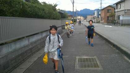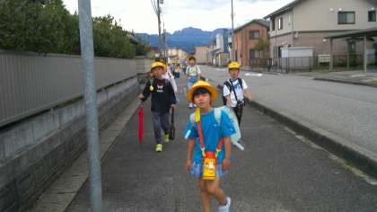 今朝は風が強く、安全帽を手で押さえたり、手に持っている子供も多かったです。今日のような風が強い日は帽子が飛ばされ車道に出るなど危険なことが予想されるので、朝からランドセルに帽子を入れてくるとよいでしょう。
