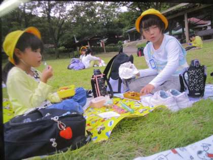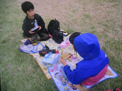 お昼ご飯は芝生広場で、友達となかよく食べました。