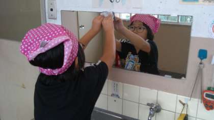 鏡ふきの達人を見つけました。新聞紙を使ってくもりを取っていましたよ。ピッカピカになりました。