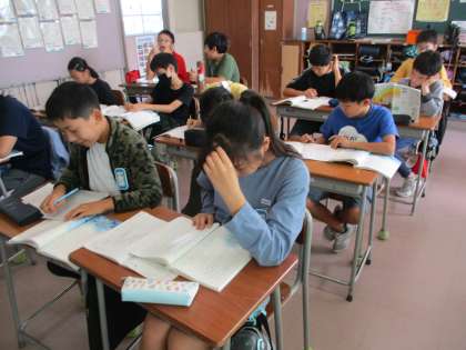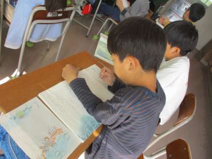 「やまなし」の学習です。難しいお話ですが、何度も読み返したり友達と話したりしながら、作品の世界を想像しています。