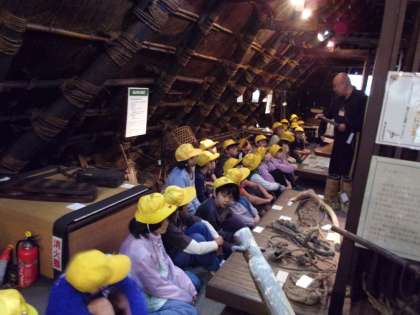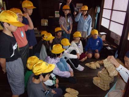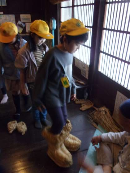 昔の道具がたくさんあります。わらぐつを実際に編んでいるところを見せてもらいました。はいてみると、以外とあたたかく感じました。