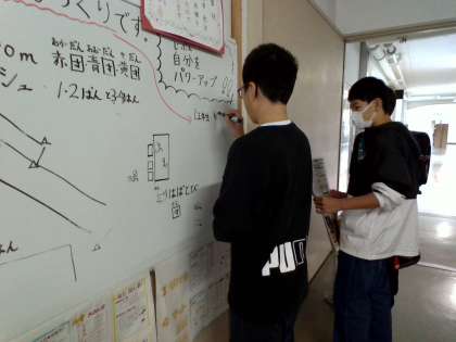 水曜日の大休憩は体力つくりタイムです。保健体育委員が中心となり、今日の活動内容を全校に知らせています。