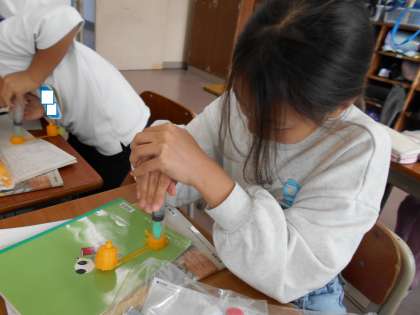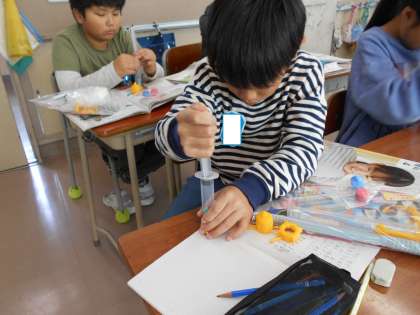 注射器に空気や水を入れておし、手応えを感じています。