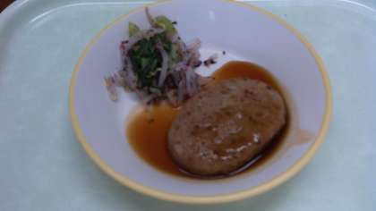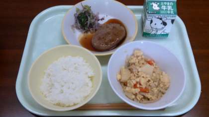 ごはん 牛乳 照り焼きハンバーグ ゆかり和え 卵とじ 検食 異常なし