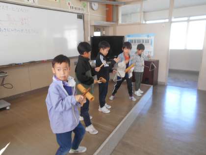 音楽の学習で、実際に音を鳴らして5種類の楽器から自分のお気に入りの楽器を決めました。お気に入りの楽器を使って音楽に合わせて演奏しました。