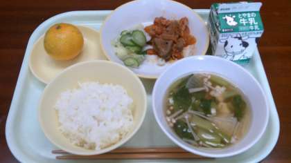 11月15日(金)今日の献立 公開日 2024/11/16 更新日 2024/11/16 給食室 ・ごはん ・牛乳 ・そえ野菜 ・豚肉とレバーのケチャップソース炒め ・すまし汁 ・みかん 検食、異常なし。 デザートにみかんがついています。ビタミンCを摂取して、風邪予防に努めましょう!