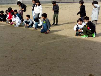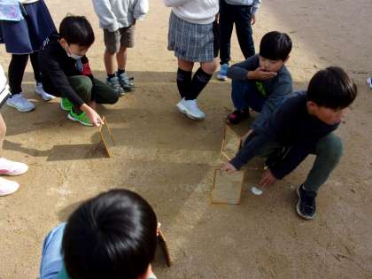 鏡ではね返した日光の進み方を調べました。光の道を地面に這わせたりはね返した日光をつないだりして楽しみました。