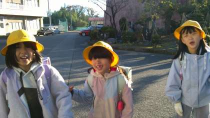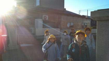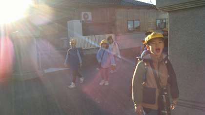 朝日を浴びて、今日もがんばるぞと、笑顔の子どもたちです。