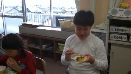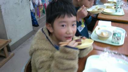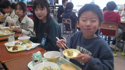 学校で育てたさつまいもの収穫をお祝いして、ファミリーで会食をしました。調理員さんが、さつまいもを蒸してくださり、みんなでいただきました。