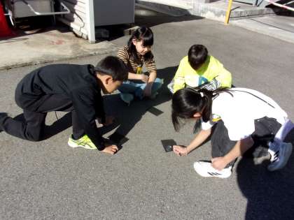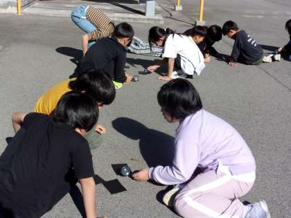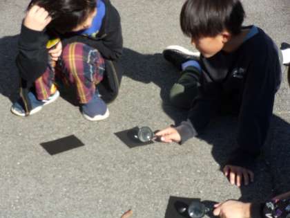 今日は、虫めがねを使って日光を集めました。日光を集めたところを小さくすると、まぶしいくらい明るくなり、けむりが出てくるのを見て「すごく熱くなっている」と、驚いていました。